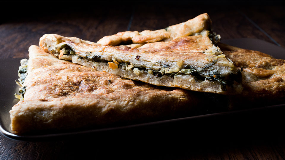 Hamurun içine sirke koymak hamurun dokusunun ağızda dağılan kıvamda olmasına yardımcı olacaktır. Dilerseniz evde kalan peynirlerden bir iç harç hazırlayabilirsiniz. İstek halinde üzerine susam ilave edebilirsiniz. Ispanakları ayıklayın ve sirkeli suda bekleterek kirlerinden arındırın. Daha sonra bol suyla durulayın ve suyunu süzdürün. Soğanı küp küp yemeklik doğrayın. Tavayı ve zeytinyağını ısıtın. Soğanları kavurun ve ıspanakları ilave edin. En son tuz ve karabiberi ekleyip soğuması için harcı dinlendirin. Tereyağını eritin. Unu bir kaba eleyin. Su, zeytinyağı, sirke ve tuzu ilave ederek hamur pürüzsüz bir kıvama gelinceye kadar yoğurun. Yoğurduğunuz hamuru 8 eş parçaya bölün ve yuvarlak bezeler haline getirin. Bezeleri yaklaşık 15 dakika üzerini temiz bir bezle örterek dinlendirin. Fırını 180 dereceye ayarlayın. Bezeleri nişastalayarak genişletin. Yaklaşık servis tabağı büyüklüğüne gelen bezeleri iyice yağlayın. 4 tanesi üst üste gelecek şekilde getirin ve oklava yardımıyla 4 katı birlikte inceltin. Yuvarlak tepsi veya borcamınızı tereyağıyla yağlayın. Açtığınız hamuru tepsinin alt kısmına yerleştirin ve kenarlarını dışarı doğru hafifçe sarkıtın. Hazırladığınız harcı yerleştirin. Üzerine kalan 4 parçayı birleştirerek açtığınız hamuru kapatın ve alt kenar ve üst kenarı birleştirerek içe doğru yuvarlayın. Hamurun ortasına bir çay bardağı koyarak üst katmadanda minik bir yuvarlak parça kesin. Bu parça referans olacak şekilde sadece üst katmanın hamuruna dilim dilim kesikler atın. Hazırladığınız böreği iyice yağlayın ve buzdolabında 15 dakika dinlendirdikten sonra yaklaşık 30-35 dakika nar gibi kızarana kadar pişirin. İşte bu kadar, afiyetler olsun!